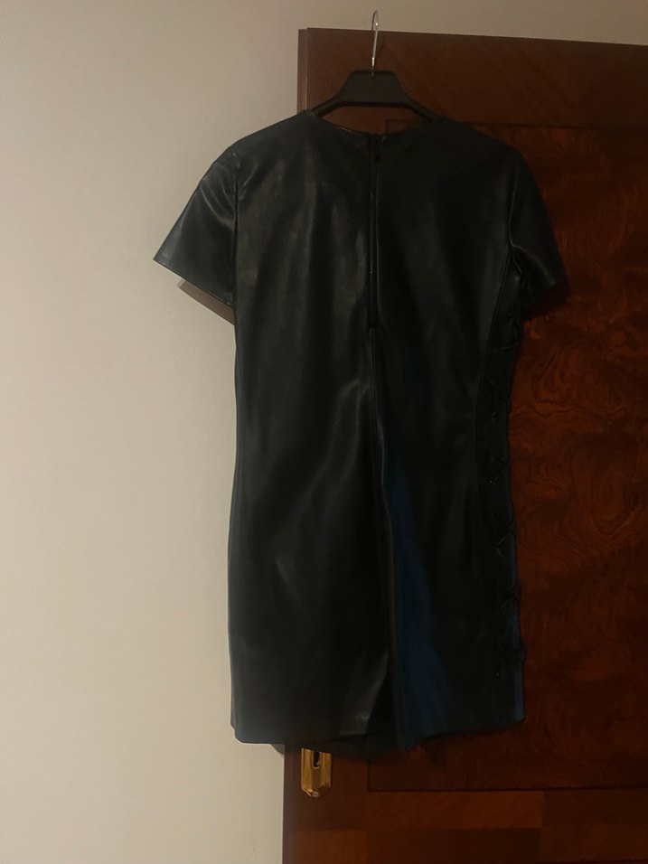 Zara Deri Dar kesim siyah midi elbise, kısa kollu, yuvarlak yakalı ,gotik tarzda sade ve desensiz tasarıma sahip.