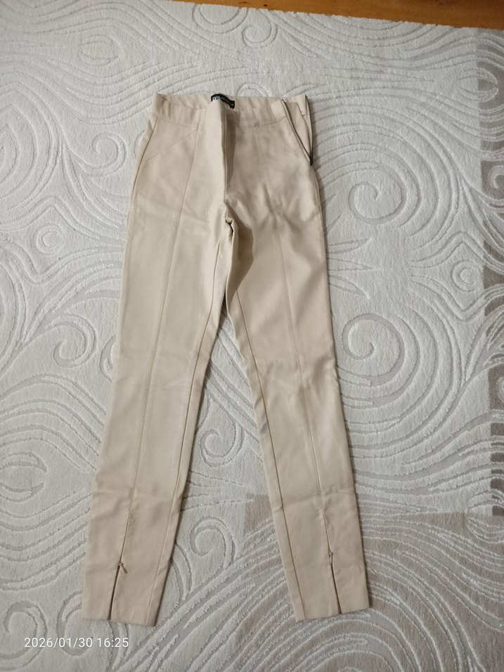 Bej renkli, kemerli, normal boy ve regular fit kadın deri pantolon, sokak modasına uygun ve ofis kullanımına uygundur.