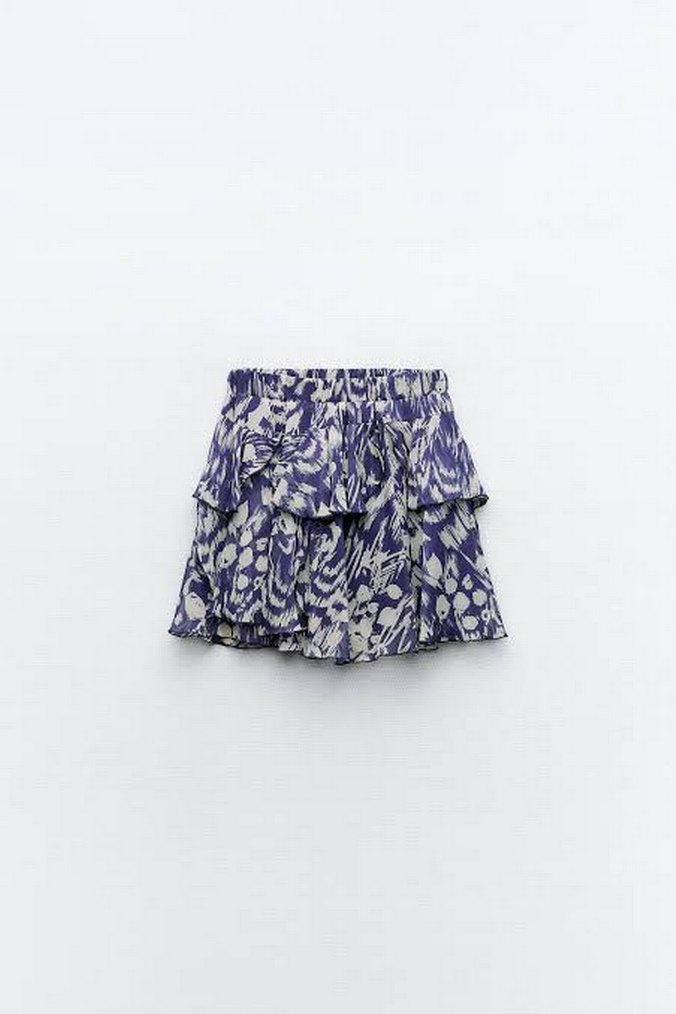 Fırfırlı katmanlara sahip, bol kesim mini etek. Yumuşak sentetik kumaştan, bohem tarz için ideal.
