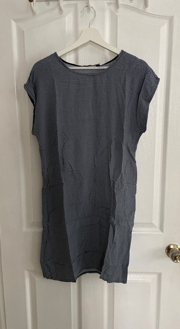 Sentetik kumaştan, kısa kollu, salaş kesim desenli midi elbise. Plajda üstüme takarım diye aldım hiç giymedim.
