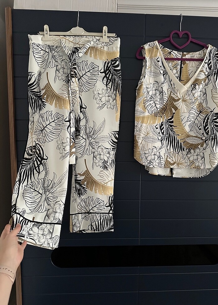 Desenli saten takım elbise. 40 beden uyumludur. 60 -62 kg kadar giyilmektedir. Beli lastiklidir. Sırt dekolteli özel günlerde kullanılabilir. Hasarsızdır. Marka temsilidir.