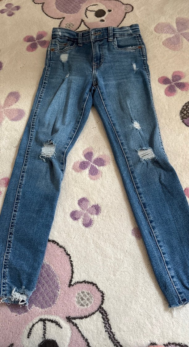Diz kesikli, normal boyda, mavi tonlarında, fitted kesim, casual tie-dye desenli kız çocuk denim jean pantolon. Kalıbı dardır