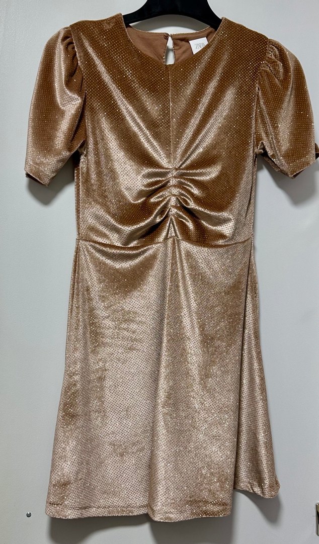 Zara Bej renkte, drapeli detaylı ve parlak kadife kumaştan midi uzunlukta, v yaka kısa kollu abiye elbisedir. Şık ve modern bir parti kıyafetidir. ✨