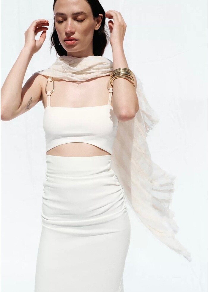 Zara drapeli dekolte detaylı midi elbise. Eteği arkadan yırtmaçlı. Arkası dikişe gizlenmiş fermuarlı. Dar kalıp. Sıfır etiketi ve kusursuz