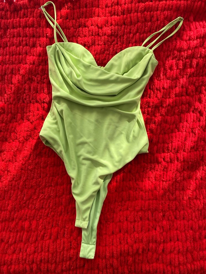 İnce askılı, drapeli ve pastel yeşil renkte, vücuda oturan kadın mayo&büstiyer. Parti için uygun cesur tarzda. Xs beden