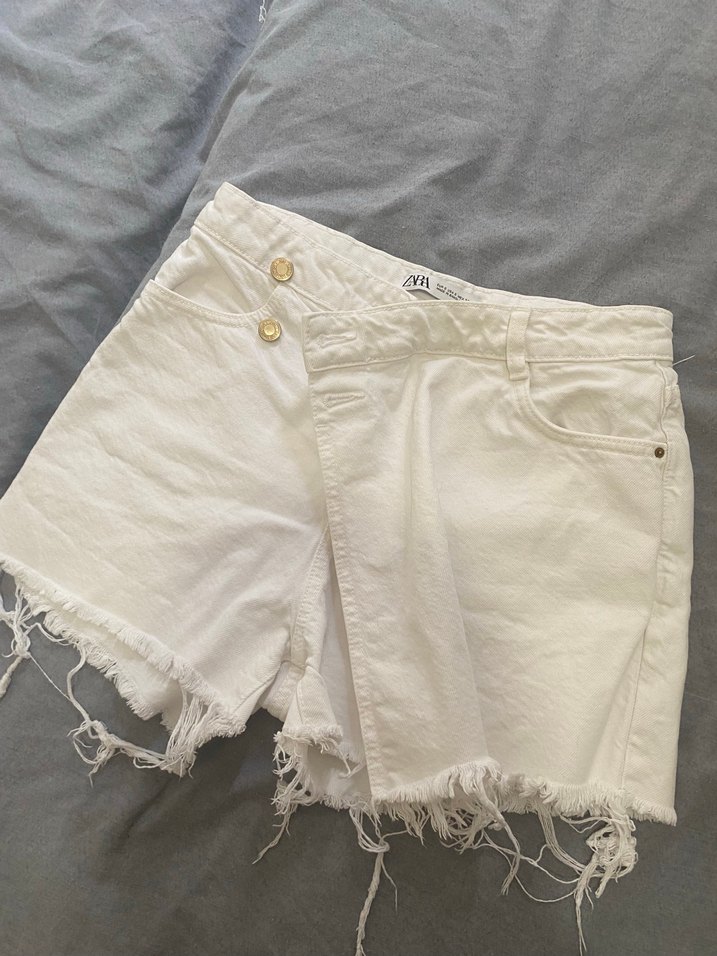 Pamuk kumaştan yapılmış, düğmeli kapamalı, bol kesim ve püsküllü kenarlara sahip beyaz mini kot şort. Günlük sokak stili için uygundur.