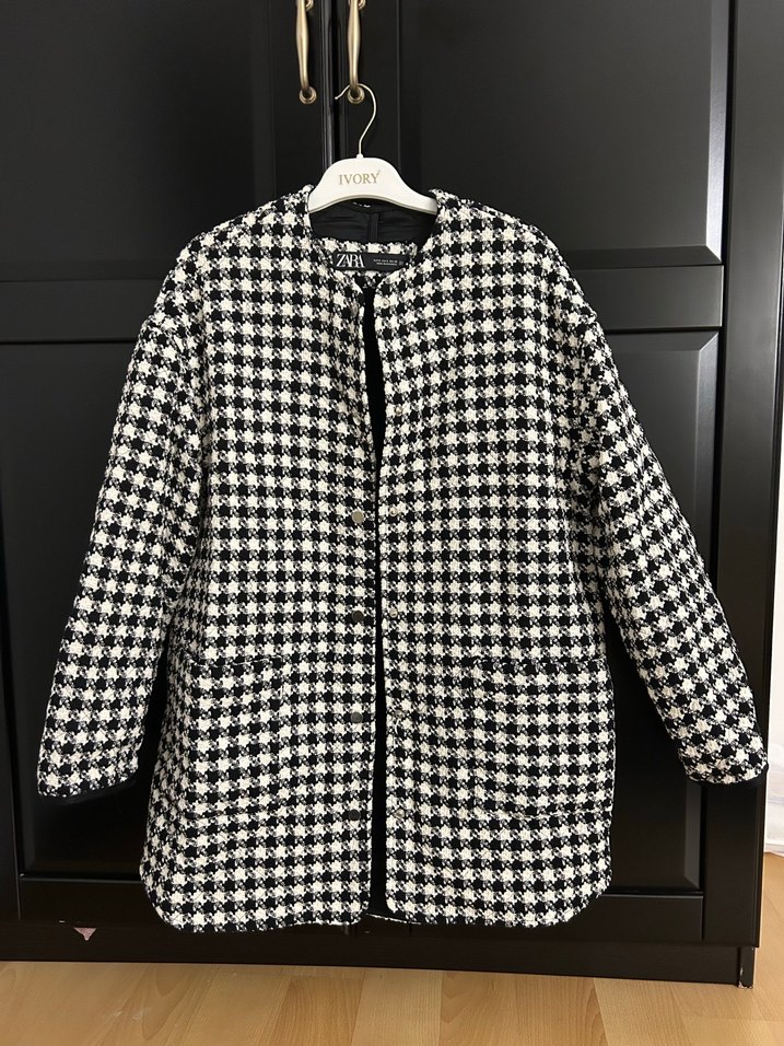 ZARA Düğmeli Beyaz Siyah Kareli Midi Kadın Kaban