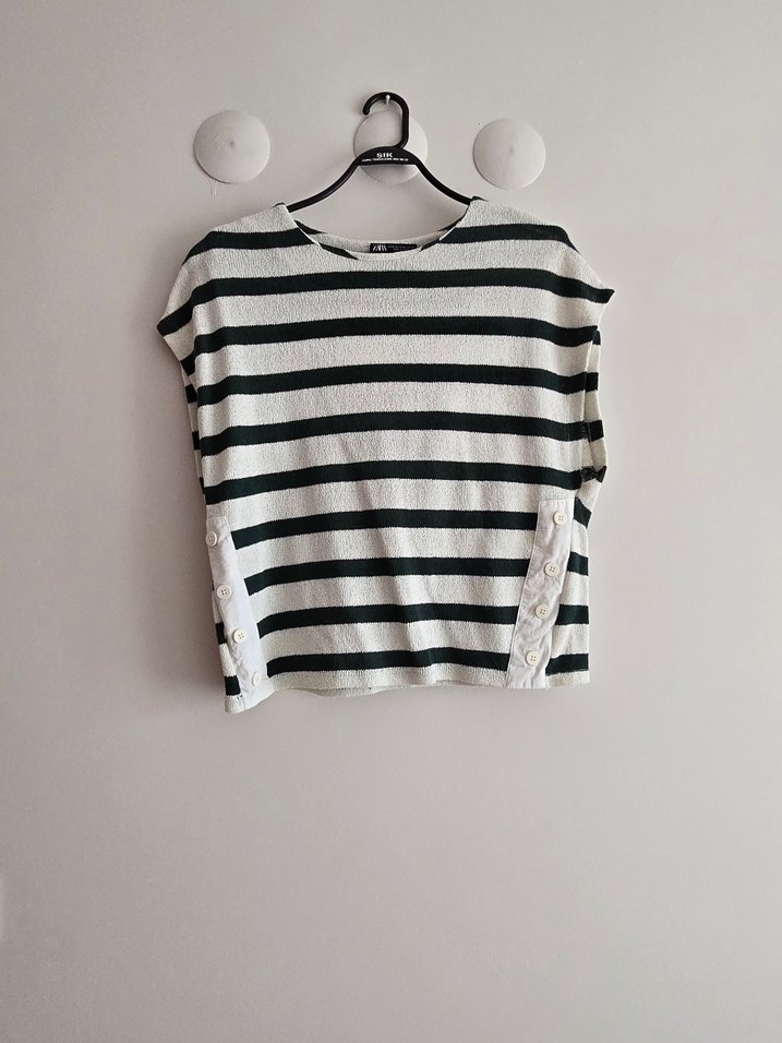 ZARA Pamuklu kumaştan, kısa kollu ve yuvarlak yakalı, gri çizgili ve yanlarında düğme detaylı bol kesim tişört. Rahat ve günlük kullanım için uygun.