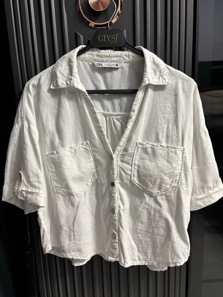 Zara Düğmeli Kısa Kollu Beyaz Keten Gömlek