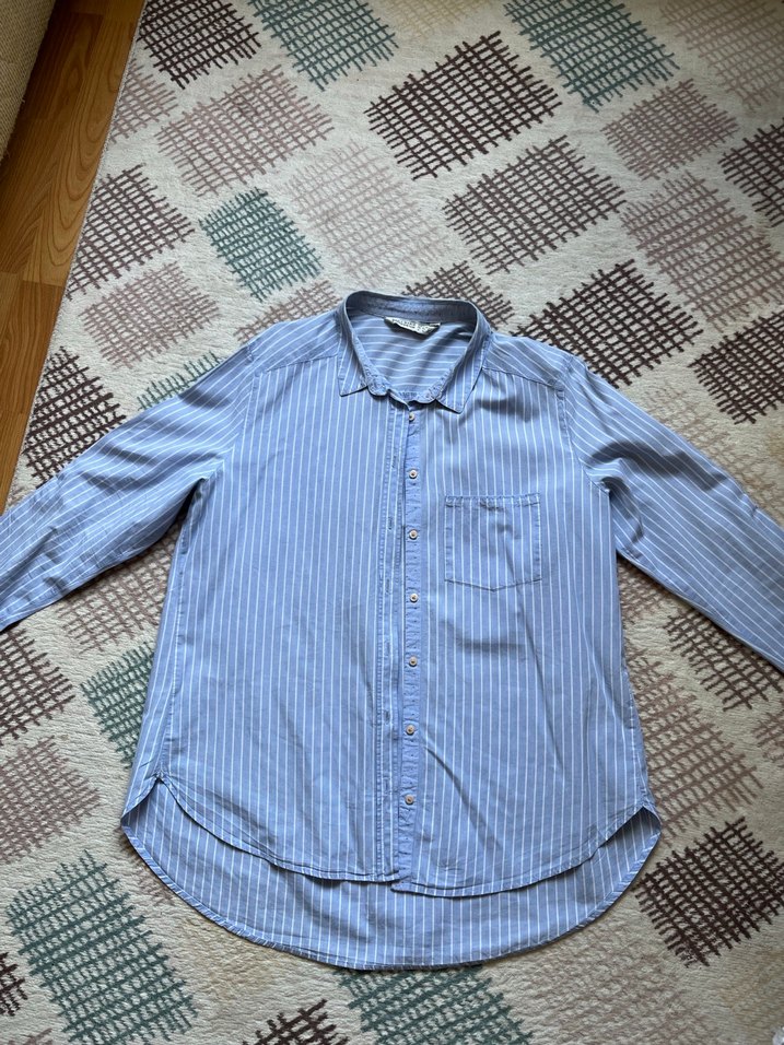 Düğmeli, kısa kollu, yakalı kadın gömleği. Mavi taban üzerine ince beyaz çizgilerle, rahat kesim ve yumuşak denim kumaştan üretilmiştir. Günlük ve sokak stiline uygun.