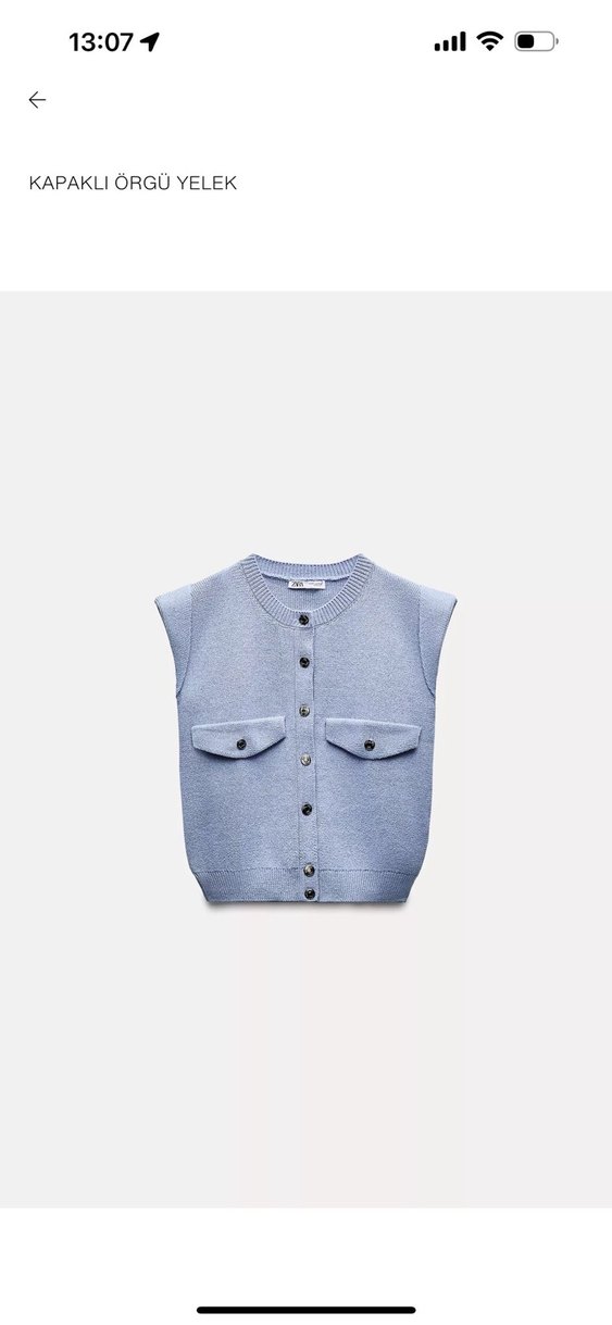 Düğmeli, mavi pastel renkte kot kumaştan, kısa kesim, salaş kesim ve yuvarlak yakalı kadın yelek. Önünde iki cep bulunmaktadır.