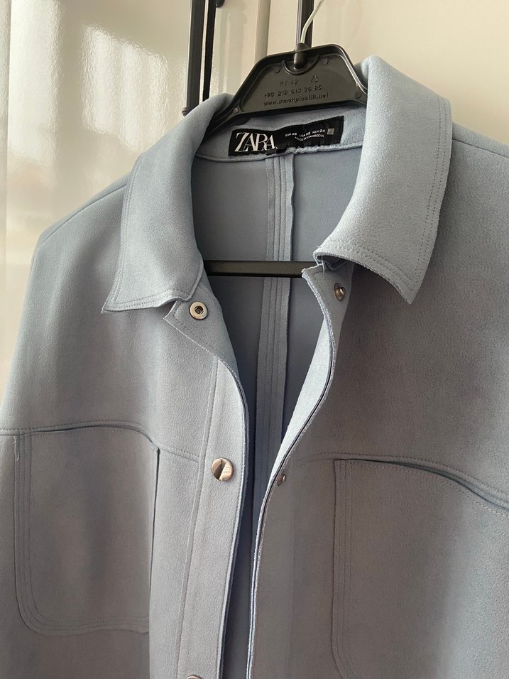 Mavi süet kumaştan, düğmeli ve kesimli yaka detaylı, uzun kollu, düzenli kesim midi kadın kaban. Minimalist ve şık bir günlük parça.