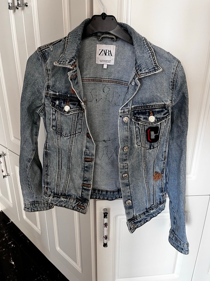 Zara marka, düğmeli ve nakış detaylı, uzun kollu, normal boy kot ceket. Notlu yaka ve rahat sokak stiliyle günlük kullanıma uygun.