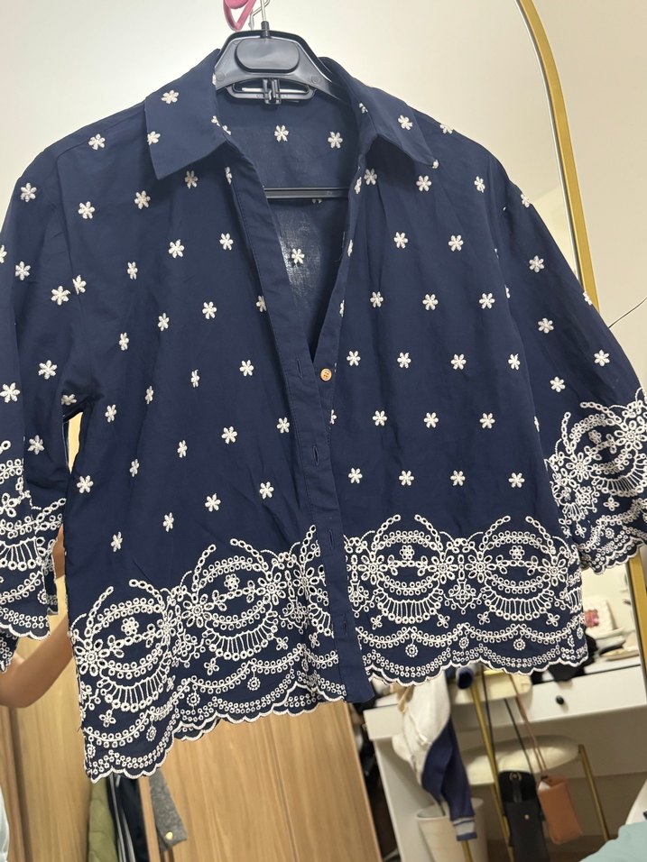 Mavi renkte, düğmeli ve nakış detaylı kadın gömleği. Kısa kollu, yakası kesik ve bol kesimdir. Normal midi boyda, günlük kullanıma uygun bohem tarzda.