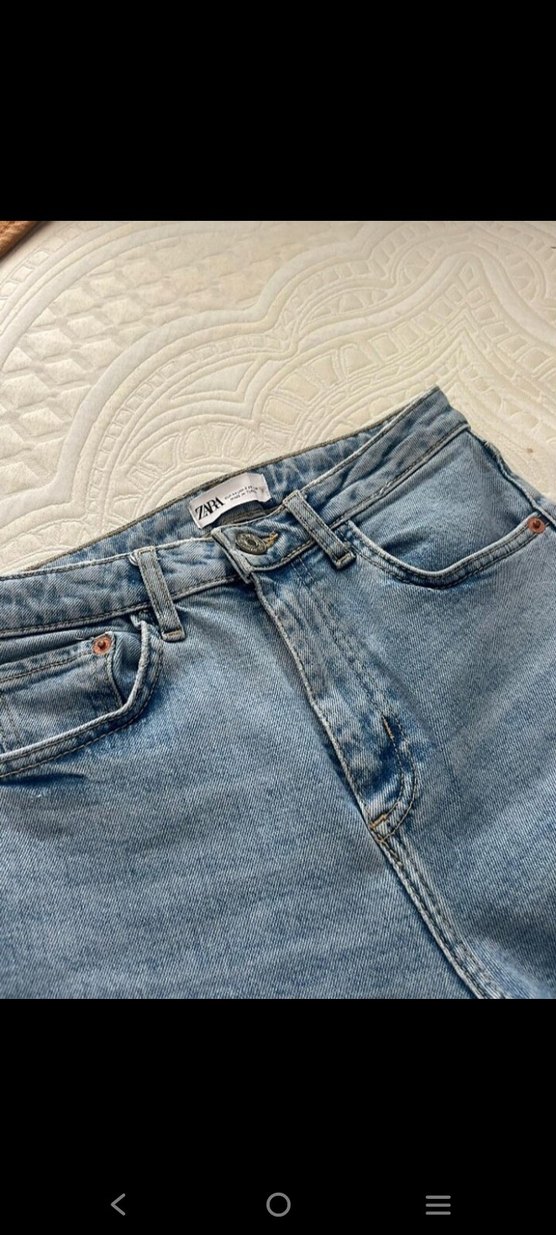 Zara marka, düğmeli regular fit, mavi denim kadın jean. Nakış detayları ve midi boy ile günlük kullanıma uygun rahat bir model. 34 beden