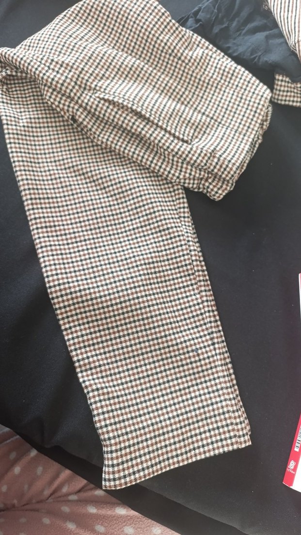 Düğmeli, regular fit kumaş pantolon, kahverengi ve gri tonlarında ince kareli desenli, sokak stili ve günlük kullanımı için uygun.