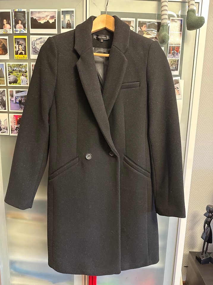 Düğmeli, çift sıra siyah klasik kaban, önünde iki cep ve yumuşak, sıcak kumaştan üretilmiştir.