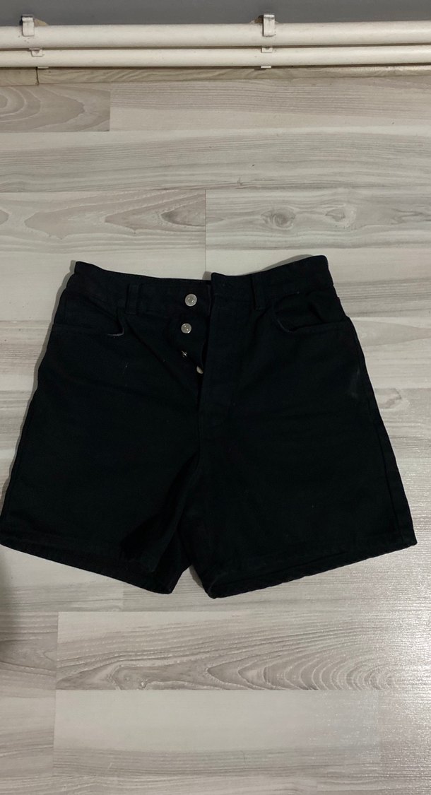 Düğmeli, pamuk kumaştan yapılmış siyah mini kot şort. Rahat kesimi ve günlük kullanıma uygun yapısıyla minimalist sokak stiline uygundur.