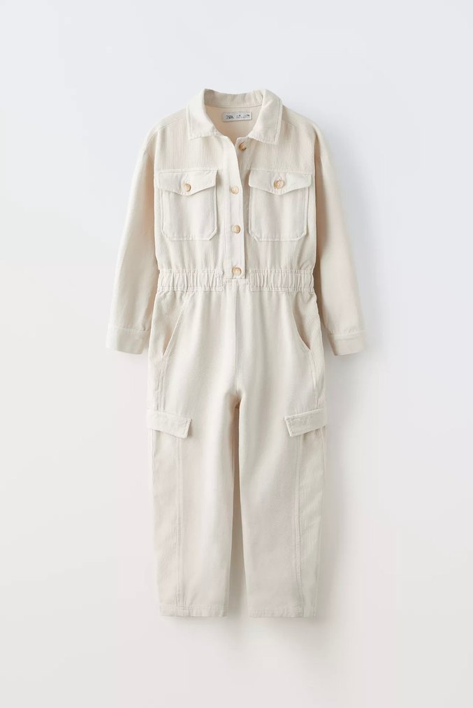 Ekru pamuklu kumaştan, uzun kollu ve yakası kesik detaylı tulum. Midi boy ve rahat kesimle günlük kullanıma uygun minimal stil sunar. 1-2 kez giyildi.