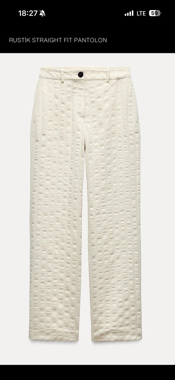 Ekru keten kumaştan pilili, normal kesim midi uzunluğunda kadın pantolon. Minimalist tarzıyla günlük kullanıma uygundur.