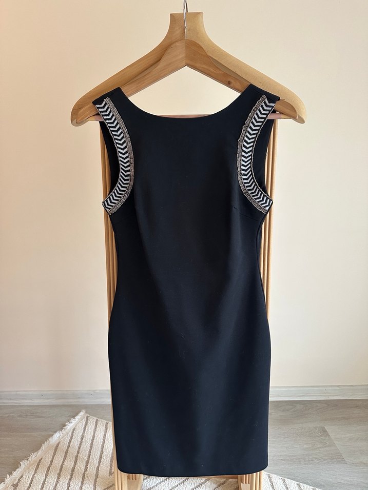 Siyah elbise, sırtı hafif u şeklinde kolu girik kol kenarlarında boncuk işleme detayı var. Sadece 1 kere giyildi.
