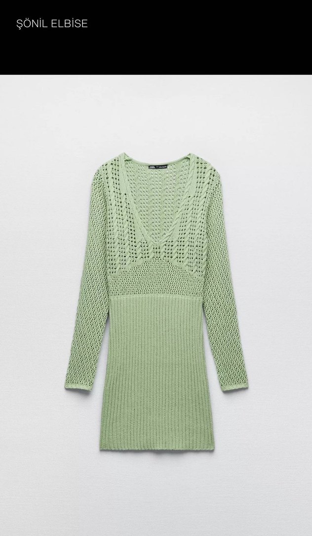 Pastel haki renkte, yumuşak triko kumaştan yapılmış, uzun kollu, V yakalı, mini elbise.