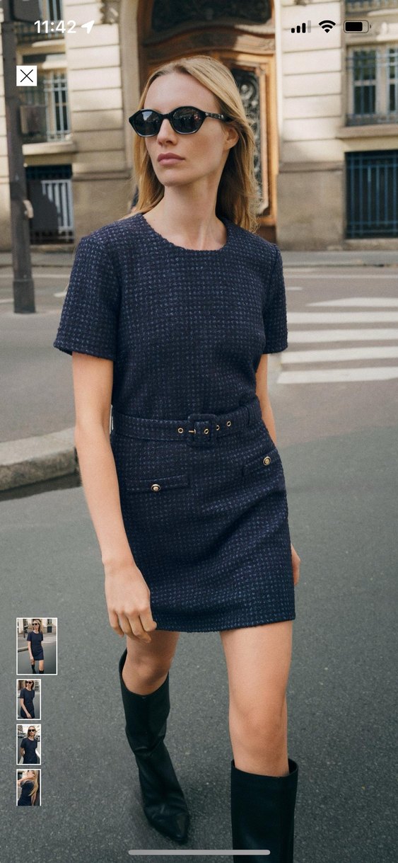 Lacivert kareli triko elbise, kısa kollu ve yuvarlak yakalıdır. Kemerli bel detayı ve mini boyuyla ofis ya da günlük kullanıma uygundur.