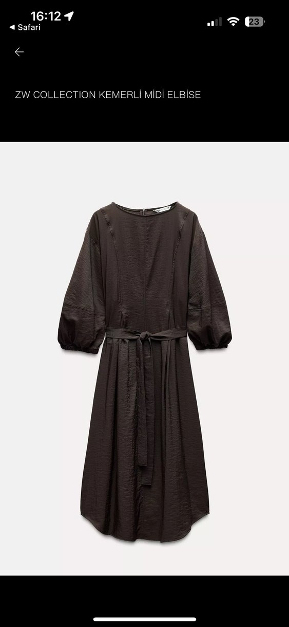 Kahverengi uzun elbise, bol kesim ve kemerli bel detayına sahiptir.