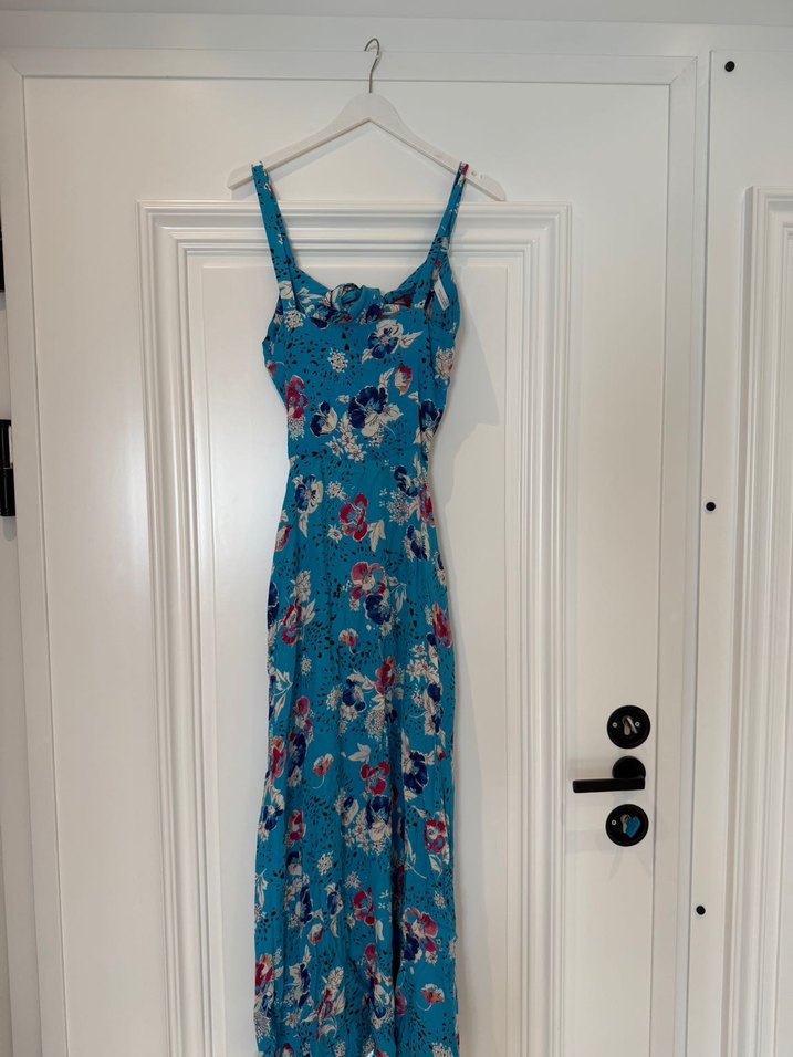 Turkuaz renkte, askılı ve straplez görünümlü, bağlama desenli uzun bohem elbise. Yumuşak sentetik kumaştan, vintage tarzda ve romantik akşamlar için uygun.