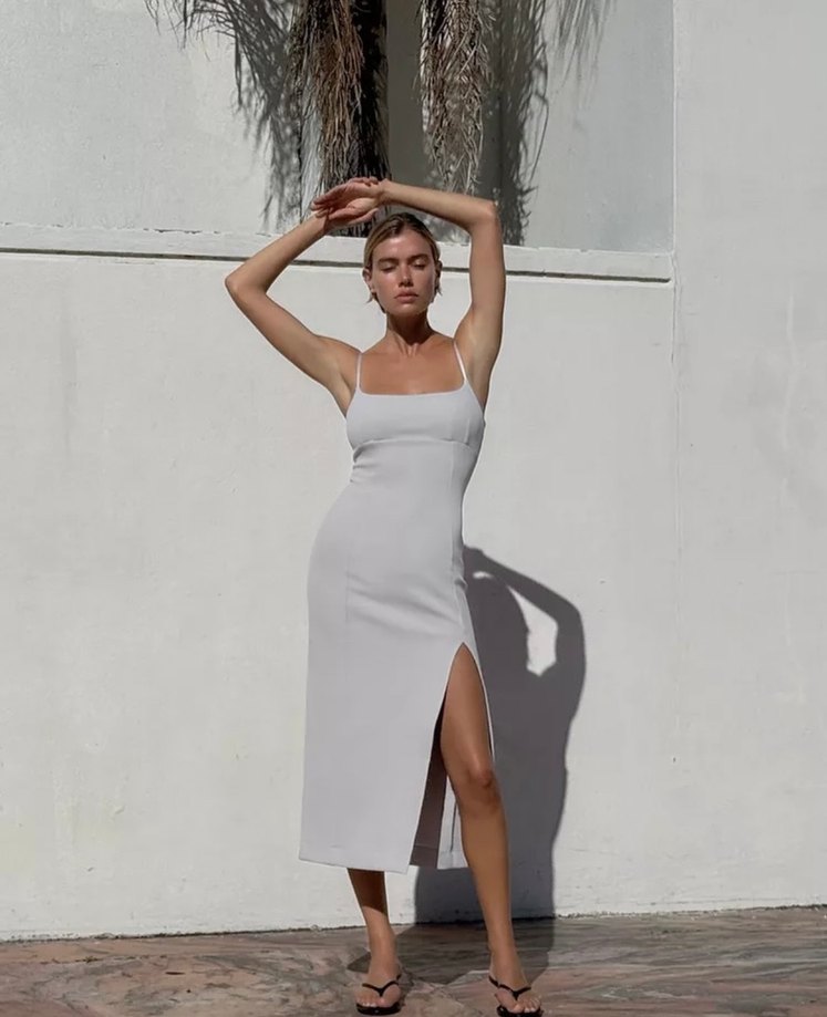 Düz gri renkte, ince askılı ve düz yakalı, sentetik kumaştan yapılmış uzun ve vücuda oturan elbise. Yanında yırtmaç bulunur, dış mekan sokak modası için uygundur.