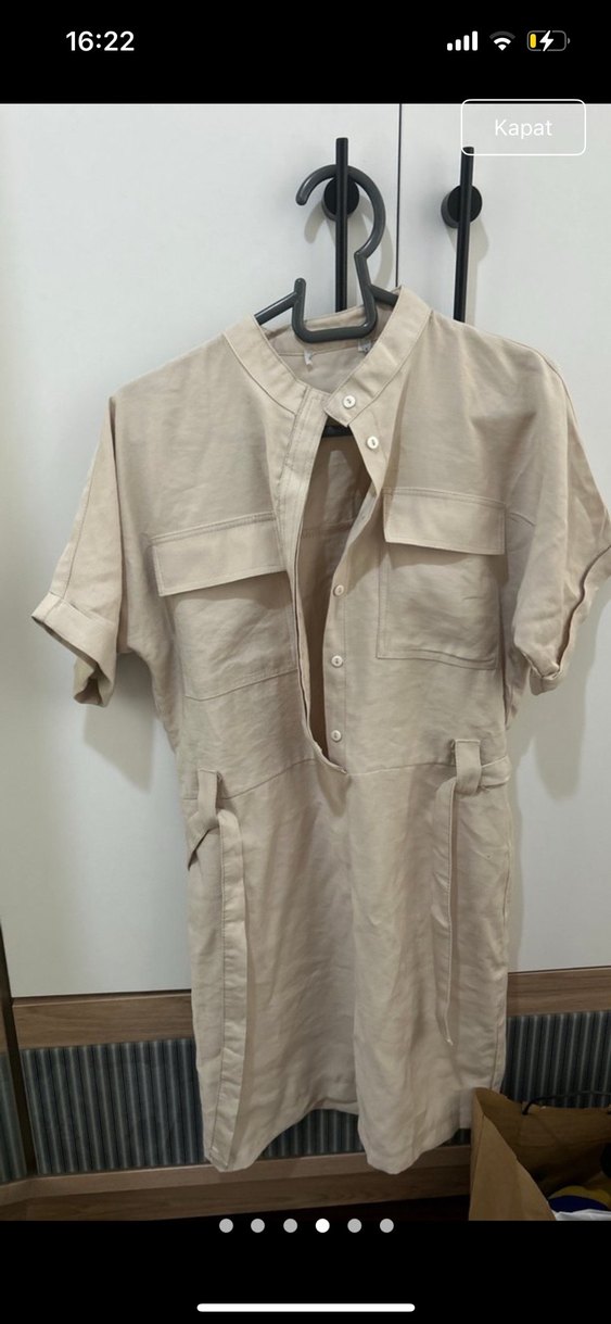 Bej keten kumaştan, kısa kollu ve yakalı, düğmeli rahat kesim mini tulum. Minimalist ve sokak modası stilinde, günlük kullanıma uygun.
