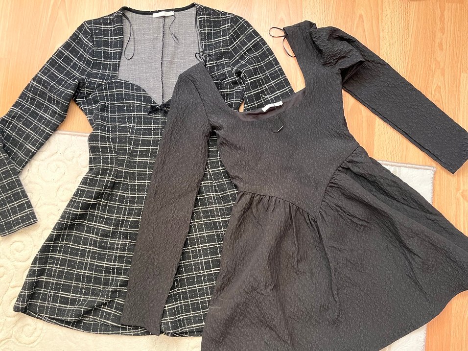 HİÇ GİYMEDİM İKİSİNİ DE. Alalı 1 hafta kadar oluyor. Etiket ipi var ama etiketleri kopmuş ya da mağazada mı koparttılar hiç bilmiyorum açıkçası. Tek ürün içindir ikisi için de yorum yazabilirsiniz. Siyah renkte dokulu kumaştan üzerinde gri ve gold yansımalar var. V yakalı gibi ve uzun kollu, mini kurdele ayrıntısı var ve ekose desenli , vücuda oturan elbise. Çok beğenerek aldım şehir dışından ama hiç denememiştim evde deneyince olmadı Sivas’ta da Zara yok iade edemedim açıkçası çok üzgünüm alana hayırlı olsun