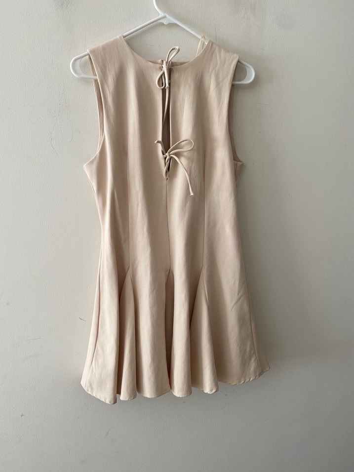 Bu bej kolsuz midi elbise, straplez yaka ve volan detaylarına sahip, yumuşak sentetik kumaştan üretilmiştir. Bol kesimi ve bohem tarzıyla günlük kullanıma uygundur.