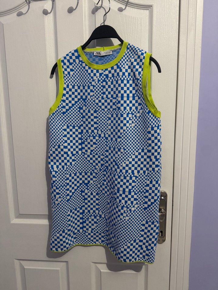 Zara marka mavi beyaz kareli desen ve yeşil kenarlıklarıyla triko kısa elbise. Hiç kullanılmadı, hiçbir deformesi kusuru yok, mağazadan alındığı haliyle duruyor, yeniden farksız.