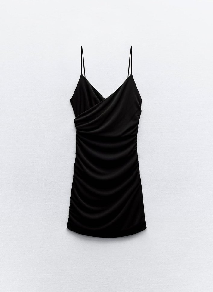 Zara kısa drape elbise. Yeni ve etiketli Triko kumaştan kısa elbise. Ayarlanabilen ince askılı, derin dekolteli kruvaze yaka. Drapeli kumaştan. Astarlı. Gizli yan fermuarlı