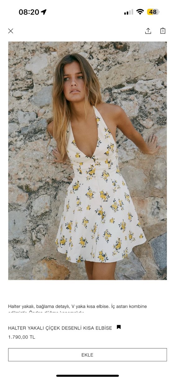 Sarı çiçek desenli mini elbise, halter yaka ve bağlama detaylarına sahiptir bir defa giydim temizdir