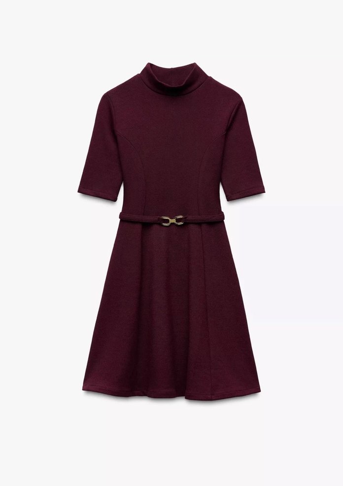 Bordo renkli, kemerli ve yüksek yakalı bu midi elbise, minimalist tarzda, ince askılı ve klasik şıklıkta ofis kullanımı için uygundur.