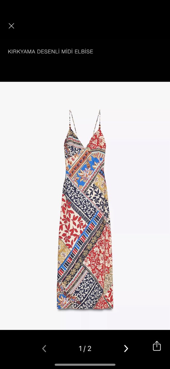 V yakalı, ince askılı, dökümlü çok renkli desenli uzun bohem elbise. Günlük kullanıma uygun, rahat kesim.