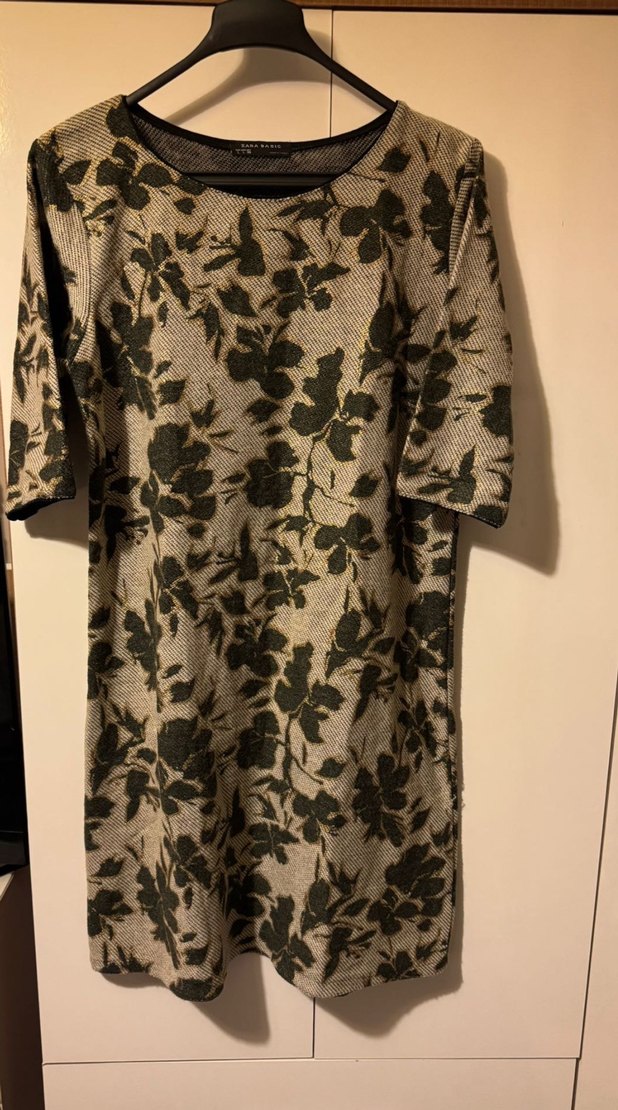 Dökümlü, kısa kollu midi elbise, yuvarlak yakalı ve sentetik kumaştan. Gri haki ve gold tonlarında yaptak desenlidir, ofis ve günlük tarzıa uygundur. Şıklaştırmak için ince çorap ve topukları yıka ile giydiğinde gecede kullanılabilir