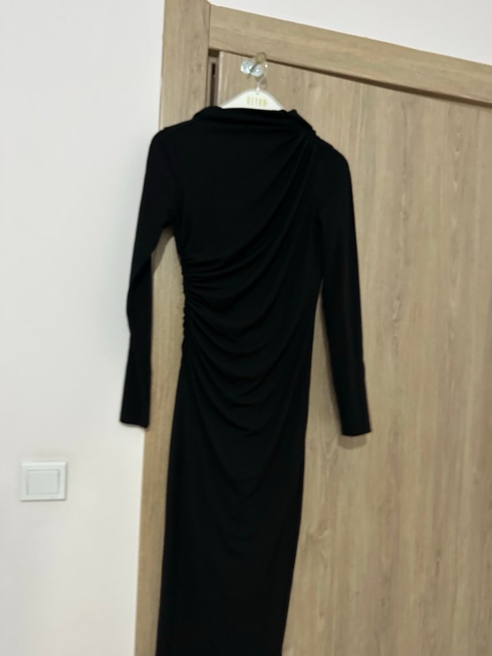Bu uzun siyah elbise, yüksek yakalı ve drapeli detaylara sahiptir. Uzun kolludur ve sade normalde yırtmacı vardı ben terzide diktirdim açtırılabilir