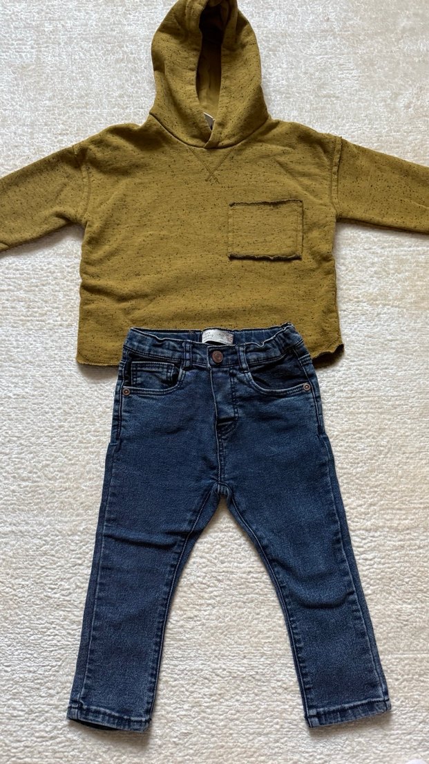 Kahverengi kapüşonlu triko, yuvarlak yaka ve uzun kollu üst ile gri kot pantolonlu bebek erkek kıyafeti.