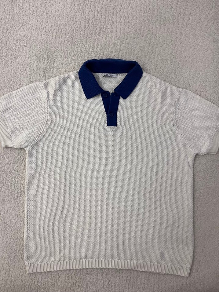 Beyaz triko dokuma, koyu renk yakalı kısa kollu polo tişört, rahat kesim ve günlük kullanım için uygundur.