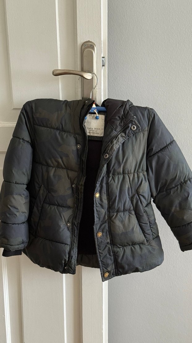 7 yaş 122cm Zara Kamuflaj desenli, notched lapel yakalı, sıcak tutan fleece kumaştan yapılmış, erkek çocuklar için fit kesim şişme mont.