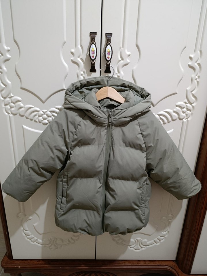 Gri renkte, kapüşonlu ve şişme tasarımlı, erkek çocuklar için fit kesim mont. Yumuşak ve sıcak kumaştan, sokak stiline uygun. orijinaldir birkaç kez giyildi sıfır ayarında