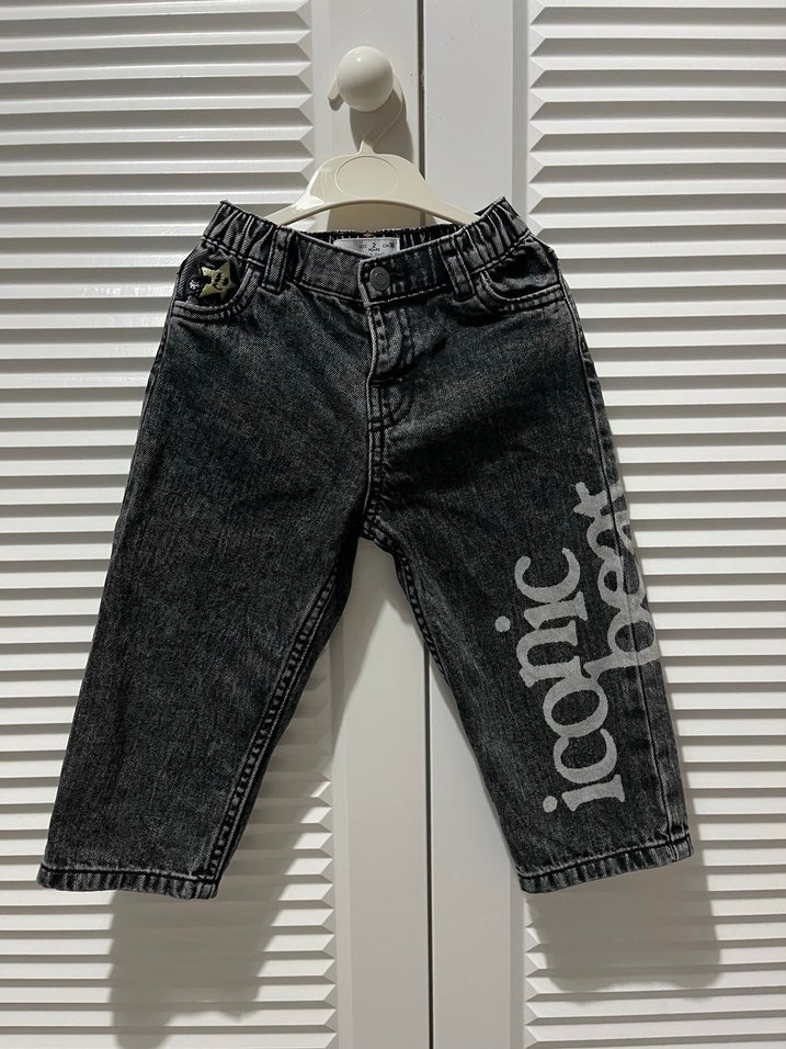 Erkek çocuklar için siyah denim pantolon, bol kesim ve bacakta baskılı desen içerir. Lastikli bel bandı ile rahatlık sağlar. 2 yaş