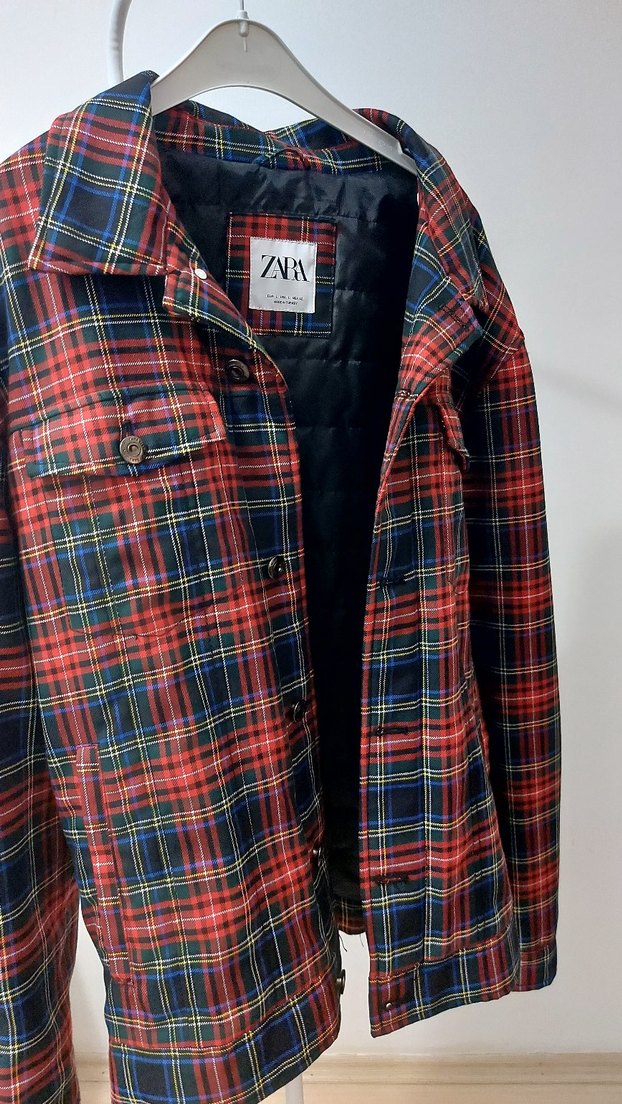 Zara marka, düğmeli, ekose desenli erkek ceket. Normal uzunlukta, regular fit ve sentetik kumaştan üretilmiştir. Uzun kollu ve notched lapel yaka detaylıdır.