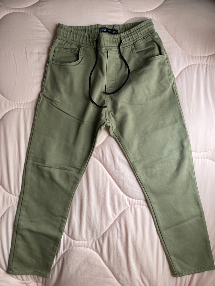 Haki renk, erkekler için rahat kesim, midi boy pantolon. Pürüzsüz sentetik kumaştan, günlük kullanıma uygun, kolay şıklık sunar.
