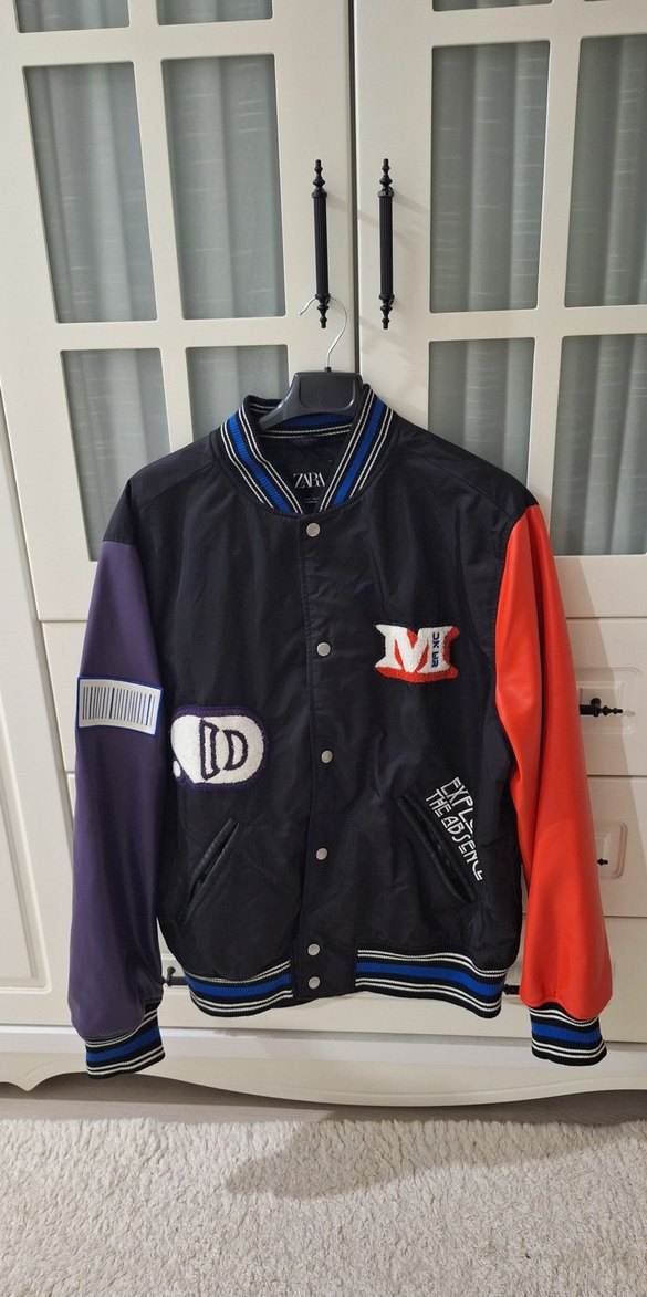 Sadece bir defa giyildi,yepyeni,sorunsuzdur.Orjinal zara.Düğmeli, çok renkli baskılı erkek deri ceket, uzun kollu ve çıtçıtlıdır. Notlu yakası ve bol kesimiyle sportif tarz sunar.