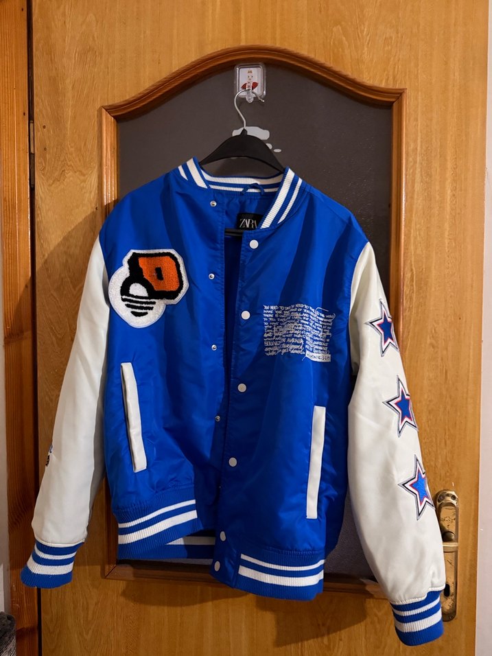 dnwr x zara, Parlak mavi gövde ve beyaz baskılı kollara sahip, düğmeli ve rahat kesim erkek ceket. Yumuşak ve sıcak kumaştan üretilmiştir. ⭐
