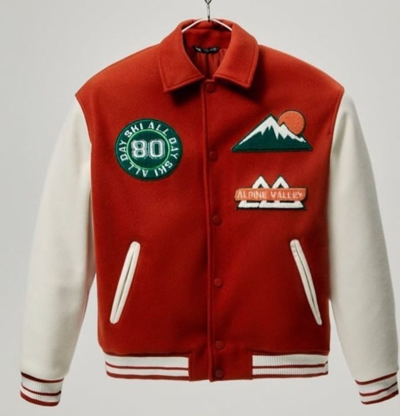 Düğmeli, uzun kollu, kırmızı parlak erkek ceket. Notch yaka ve baskılı yamalarla, şık ve rahat dış mekan kullanımı için uygundur.kalin kumaş,sıcak tutuyor. temiz kullanılmış, orijinal ürün